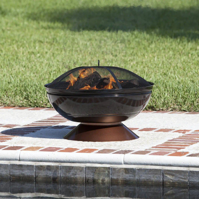 Unique fire pit with an attractive enamel-painted fire bowl and base. Beautiful copper and black gradual finish. Dome mesh spark screen with high heat paint. Features a wood and cooking grates for versatile uses. Includes a screen life tool. Dimensions: 26” Diameter 21” Height.